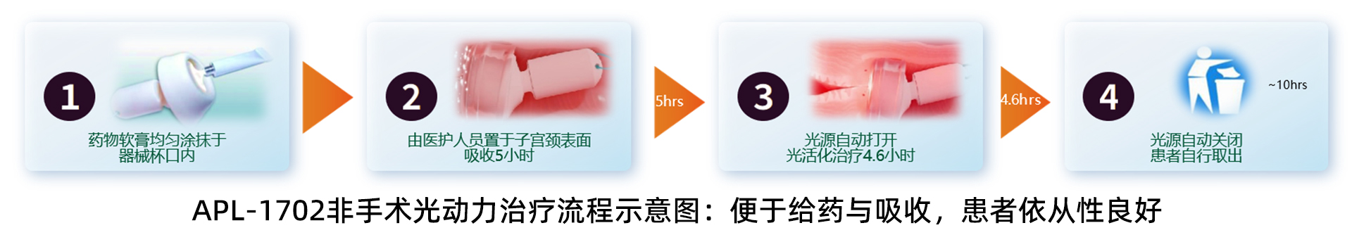 APL-1702是一款全球首创、中国首发的光动力治疗产品,由盐酸氨酮戊酸己酯软膏和一次性使用宫颈光动力治疗灯组成,通过创新的局部给药与阴道内置冷光源设计,实现了治疗模式的突破。(1)门诊“即治即走”便捷式治疗:其药械一体化设计,由妇科医生门诊操作,无需麻醉,将单次诊疗时间缩短至10分钟以内;放置后可立即恢复正常工作和生活,患者无需在医院等待,治疗完成后患者可自行取出装置。该“门诊短时放置+居家完成治疗”的模式,将极大提升医疗效率和治疗可及性,有助于在基层医疗卫生机构推广。(2)冷光源技术提升治疗舒适度:APL-1702采用的创新冷光源设计,可将治疗区域组织温度控制在42℃以内。临床数据显示,97%患者报告宫颈治疗区域无痛感,且无宫颈结构损伤记录,避免传统光动力治疗可能导致的组织热损伤,减少局部刺激,改善治疗舒适度。